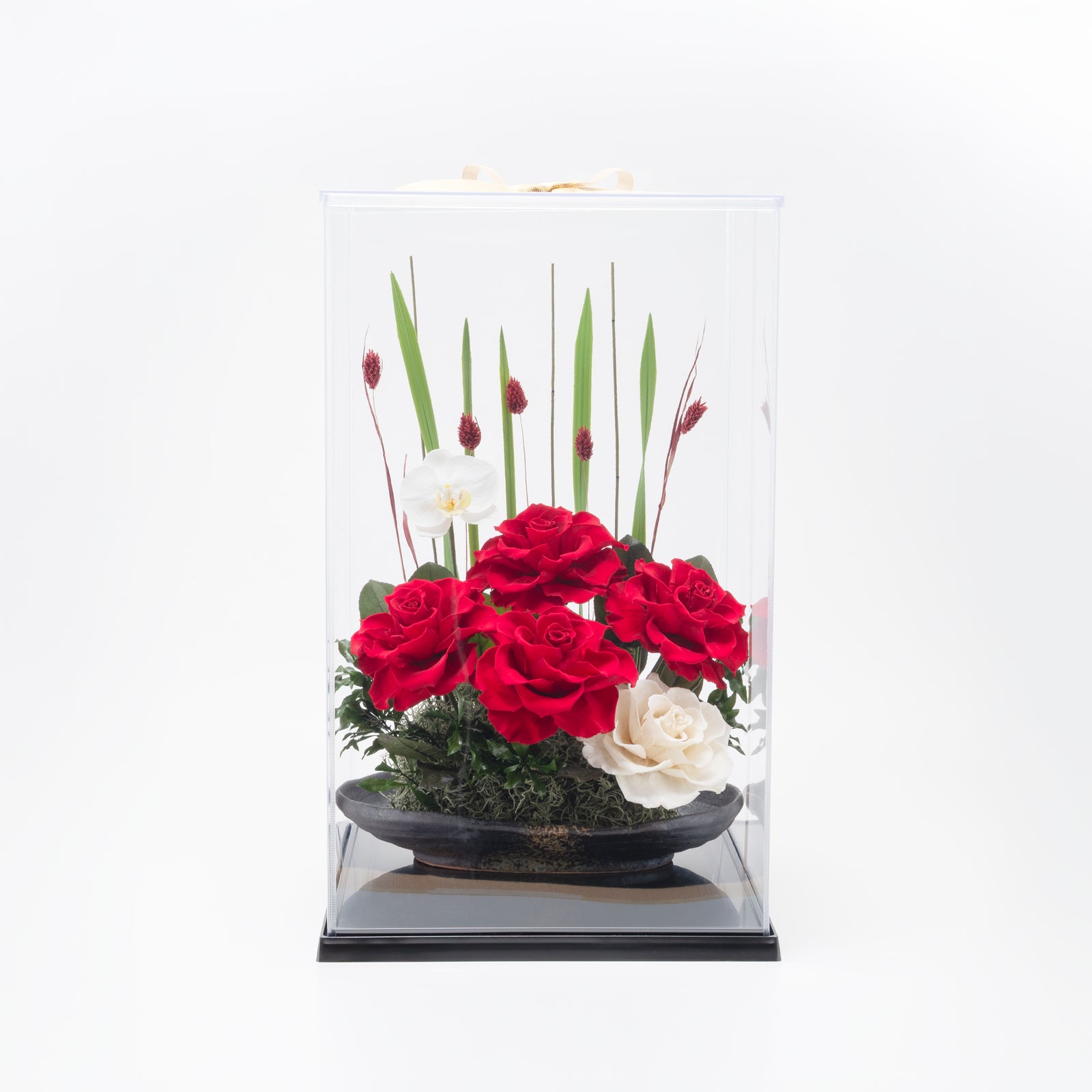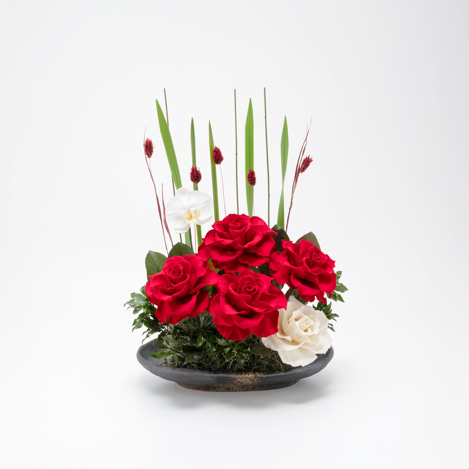 愛でたい大輪のバラを紅白の華やかな色合いでアレンジした「寿ぎ(ことほぎ)」は、お祝いの場に最適な特別な一品です。厳選された花々が格式と華やかさを添え、感謝や祝福の気持ちを心から伝えます。贈り物としても、自宅の装飾としても上品さを演出し、場の雰囲気を格上げします。